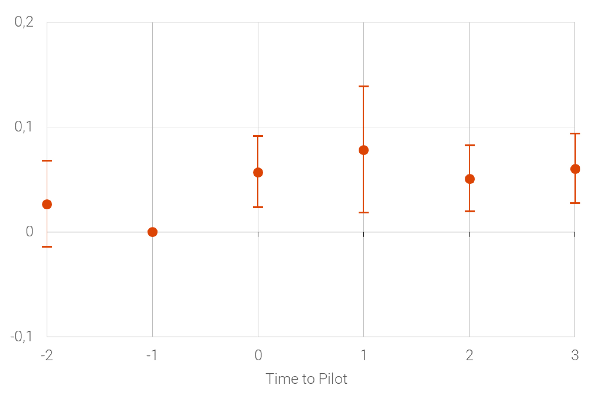 Kuva: Kuvio näyttää työnhakijaryhmien välisen rekrytoinnin todennäköisyyden muutoksen kokeilussa suhteessa kokeilua edeltävään jaksoon (-1), kun koeryhmää verrattaan verrokkiryhmään. Kuviossa verrataan hakijoita, joilla on ulkomaalaisen kuuloinen nimi sellaisin hakijoihin, joilla on suomalaisen kuuloinen. nimi. Aineisto on kuviossa jaettu 10 viikon jaksoihin.