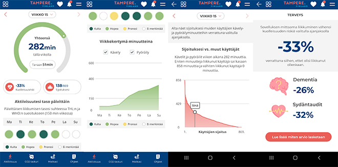 Kuva 1. Tampere.Finland-mobiilisovelluksen hiilijalanjälkilaskurin aktiivisuuslaskuri ja esimerkkejä terveystietoa tarjoavista näkymistä.