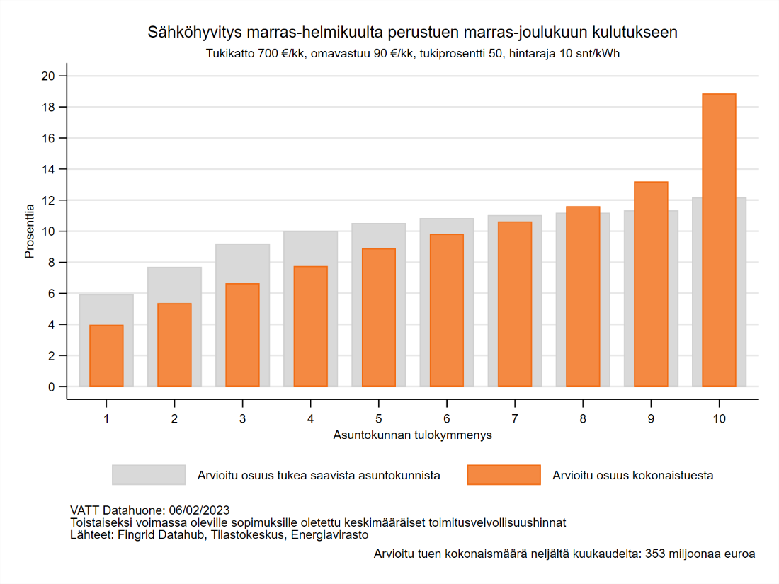Datahuone arvioi sähköhyvityksen kohdentuvan erityisesti suurituloisille asuntokunnille. Käytettävissä olevien tulojen perusteella ylimpään kymmenykseen kuuluvien asuntokuntien arvioidaan saavan noin 19 prosenttia hyvityksen kokonaismäärästä, kun taas alimpaan tulokymmenykseen kuuluvien asuntokuntien arvioidaan saavan noin neljä prosenttia hyvityksen kokonaismäärästä (ks. tarkemmin liitteessä 1 kuva 1a). Sähköhyvityksen kokonaismäärä ja tukea saavien asuntokuntien määrä tulokymmenyksessä on sitä suurempi, mitä suuremmat tulokymmenyksen tulot ovat (ks. tarkemmin liitteessä 1 kuva 1b). Samoin keskimääräinen hyvityksen määrä niillä asuntokunnilla, jotka sitä saavat, on tulokymmenyksen mukaan kasvava ainoastaan toista tulokymmenystä lukuun ottamatta. Sähköhyvitys kohdistuu erityisesti suurituloisille, koska sähkönkulutus kasvaa asuntokunnan tulokymmenyksen mukaan. Tulojen ja kulutuksen positiivinen yhteys selittyy muun muassa sillä, että suuri- ja keskituloisiin asuntokuntiin kuuluu keskimäärin pienituloisia selvästi enemmän asukkaita, ja sähkölämmitys on keski- ja suurituloisissa asuntokunnilla paljon pienituloisia yleisempää. Nämä tekijät eivät kuitenkaan yksin selitä eroja sähkönkulutuksessa.
