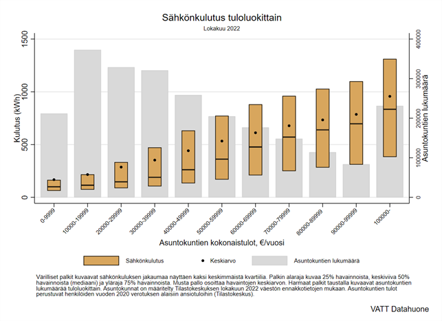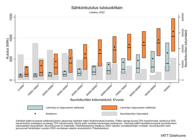 Asuntokunnat, joiden bruttotulot ylittävät 100 000 euroa, käyttävät keskimäärin viisi ja puoli kertaa enemmän sähköä kuin vähiten, alle 10 000 euroa, ansaitsevat asuntokunnat. Niinpä myös valtion tukitoimet, kuten arvonlisäveron alentaminen, kohdistuvat pääosin hyvätuloisiin asuntokuntiin. Tiedot perustuvat ensimmäistä kertaa käyttöön saatuihin Fingridin Datahubin käyttöpaikkakohtaisiin tietoihin sähkönkäytöstä, jotka on yhdistetty Tilastokeskukselta saatuihin asuntokuntien taustatietoihin.