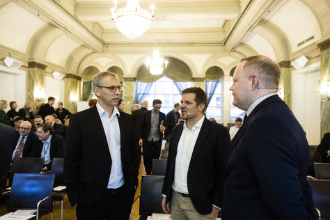 Helsinki GSE:n akateeminen johtaja Otto Toivanen, Tilastokeskuksen ylijohtaja Ville Vertanen ja VATT:n ylijohtaja Mikael Collan keskustelivat Datahuoneen 1-vuotisjuhlaseminaarissa.