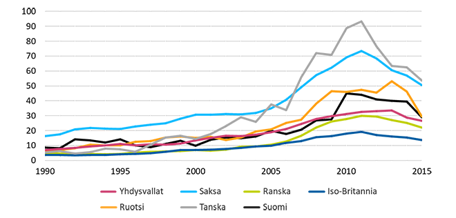 Kuinka eri maat ovat tähän asti pärjänneet puhtaan teknologian kehittämisessä? Kuviossa 1 on esitetty patentit ilmastonmuutoksen hillitsemisen teknologiaan muutamissa Euroopan maissa ja Yhdysvalloissa. Patenttien määrä miljoonaa asukasta kohti on laskettu OECD:n patenttitilastosta.