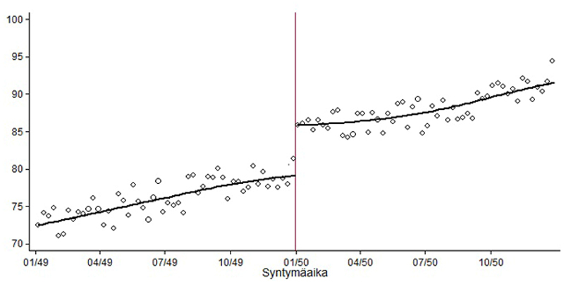 Oheinen kuvio havainnollistaa sekä tutkimusasetelmaa että keskeisintä tulosta. Vaaka-akselilla on syntymäaika, ja punainen pystyviiva keskellä erottaa 1949 ja 1950 syntyneet toisistaan. Jokainen pallukka vastaa keskimääräisiä työkuukausia vuosien 2004–2013 aikana tietyn viikon aikana syntyneille. Vuonna 1949 syntyneet saavuttivat putken alaikärajan vuonna 2004, 1950 syntyneet vuonna 2007. Vuoden 2013 lopussa henkilöt olivat 63- tai 64-vuotiaita, eli usein jo vanhuuseläkkeellä.