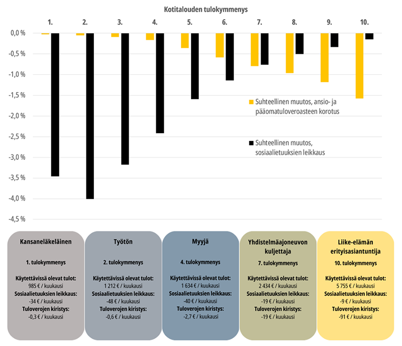 Sosiaaliturvan leikkaukset alentaisivat erityisesti pienituloisten käytettävissä olevia tuloja, kun tulonveron kiristykset kohdistuvat parempituloisiin. Yleisen arvonlisäveron korotus kohdistuisi tätä tasaisemmin eri tuloluokkiin.