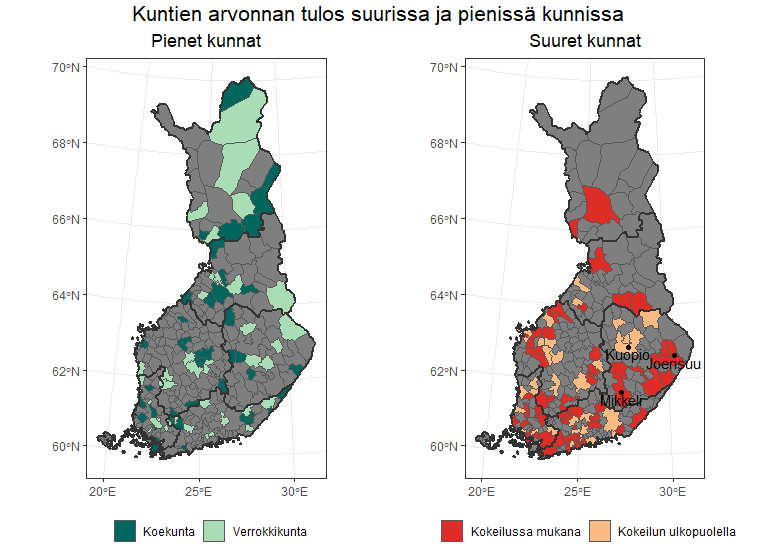 Pienet kunnat jaettiin alueellisen edustettavuuden vuoksi AVI-alueisiin perustuviin arvontaryhmiin. Tämän jälkeen jokaisesta arvontaryhmästä arvottiin puolet kunnista kokeilun koeryhmään ja puolet verrokkiryhmään. Arvonnassa pidettiin huoli siitä, että sekä koe- että verrokkiryhmään päätyi samanlaisia kuntia. Pienten kuntien kohdalla samankaltaisuuden vertailukriteereinä käytettiin kunnan keskimääräisiä tuloja, väestön koulutustasoa, ja vieraskielisten osuutta. Koeryhmään valikoitui 42 ja verrokkiryhmään 43 pientä kuntaa.