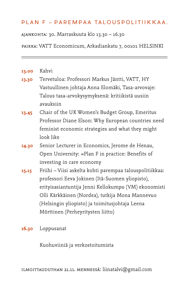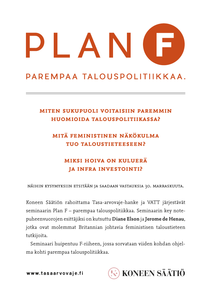 Koneen Säätiön rahoittama Tasa-arvovaje-hanke ja VATT järjestävät marraskuun lopussa seminaarin, jossa rakennetaan parempaa talouspolitiikkaa monialaisen tutkija- ja asiantuntijajoukon kanssa. Key note -puhujat Diane Elson ja Jerome de Henau ovat Britannian johtavia feministisen taloustieteen tutkijoita. Avajaissanat VATT:n puolesta esittää professori Markus Jäntti.