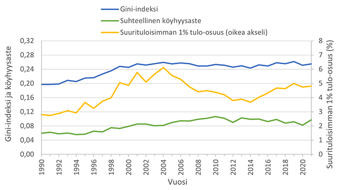 Kuvio 1: Tulojen eriarvoisuus Suomessa vuosina 1990–2021 25–60-vuotiaiden keskuudessa. Käytettävissä olevien tulojen jakauman tasa-arvoisuutta mittaava Gini-indeksi (sininen käyrä), suurituloisimman 1 prosentin tulo-osuus (keltainen käyrä) ja suhteellinen köyhyys (vihreä käyrä).