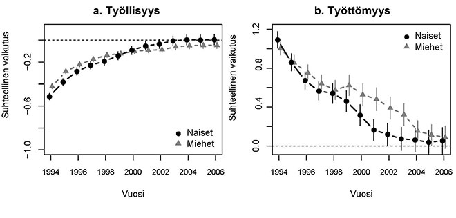 Oikeanpuoleisessa paneelissa tarkastellaan irtisanomisen vaikutusta työttömyyteen. Se kehittyy pitkälti peilikuvana työkuukausiin nähden ja on irtisanotuilla lähes puolet yleisempää viisi vuotta laman jälkeen. Naisilla vaikutus työttömyyteen tosin näkyy vielä muutaman vuoden kauemmin kuin työllisyydessä. Miesten trendissä taas on selkeä muutos vuonna 1999.