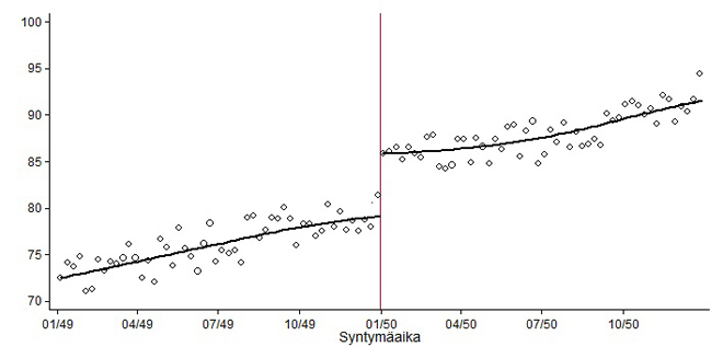 Kuviossa nähdään selvä tasomuutos 1.1.1950. Vuoden 1950 alussa syntyneet työskentelivät lopputyöuransa aikana keskimäärin noin seitsemän kuukautta enemmän kuin vuoden 1949 lopulla syntyneet. Tätä eroa työkuukausissa on vaikea selittää millään muulla kuin työttömyysputken kiristyksellä, sillä näiden ryhmien välillä ei ole merkittäviä eroja taustaominaisuuksissa. Työllisyysvaikutusta voi pitää varsin suurena, kun muistetaan, että uudistus ainoastaan lykkäsi lisäpäiväoikeutta kahdella vuodella.