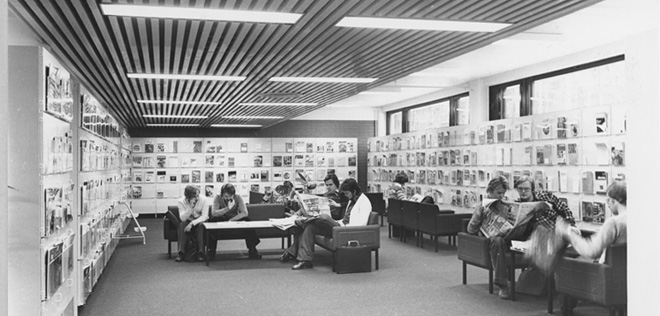 Opiskelijoita Lappeenrannan Teknillisen Korkeakoulun kirjaston lehtisalissa 1970-luvulla. Kuva: Mikonsaari Aarne / Lappeenrannan museot [CC BY-NC-ND 4.0]