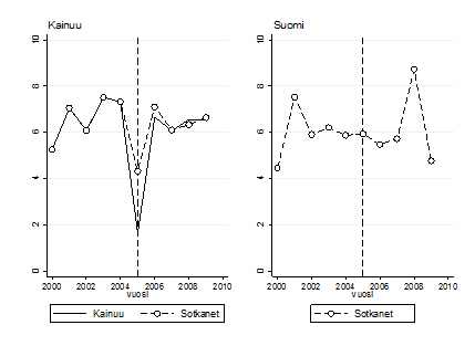 Kuviossa on kaksi silmiinpistävää tapahtumaa. Kuvion oikealta puolelta löytyy sote-menojen kasvun villiintyminen vuonna 2008. Tämä on tuttu tapaus. Kyseisenä vuonna eduskuntavaaleissa annetut lupaukset materialisoituivat julkisen sektorin korkeina palkankorotuksina. Mielenkiintoisempi tapahtuma löytyy hallintokokeilun aloittamisvuonna 2005 Kainuusta. Kyseisenä vuonna Kainuun sote-menojen kasvuvauhti pysähtyi äkillisesti jatkaen sittemmin aiemmalla vauhdillaan. Poikkeuksellinen tapahtuma osuu samaan ajankohtaan, jossa toisiinsa yhdistetään edeltävien vuosien viralliset kustannusluvut ja hallintokokeilun jälkeiset, laskennalliset kustannusluvut. Suurin huolenaihe tässä on se, että kahta tasomuotoista kustannussarjaa yhdistettäessä kaikki laskentatapojen eroavaisuudet heijastuvat suoraan yhdistämisajankohdan muutokseen. Emme siis tiedä, johtuuko äkillinen pudotus laskentateknisistä seikoista vai todellisesta, yhtenä vuonna tapahtuneesta toiminnan tehostumisesta.
