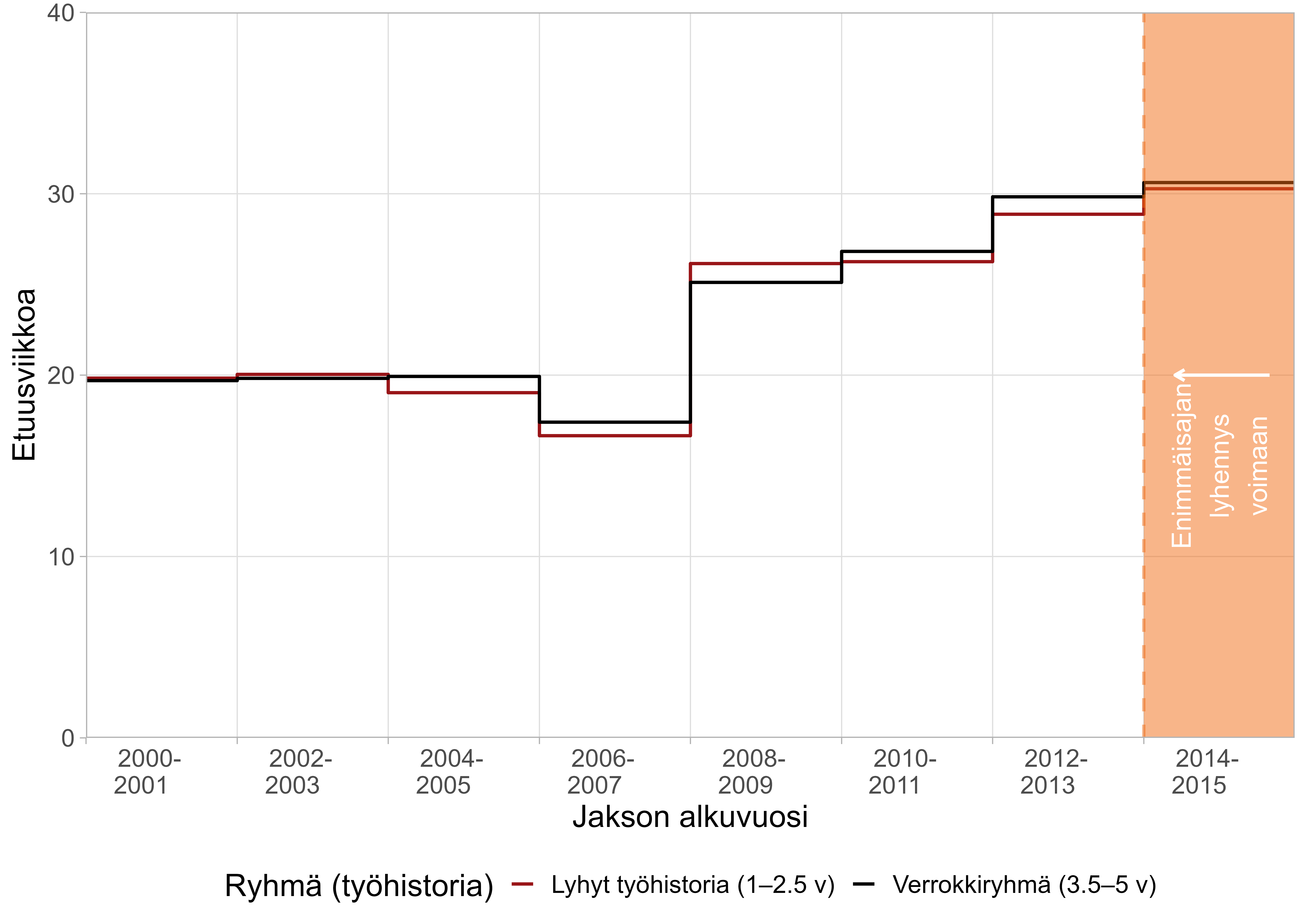 Vuoden 2014 lyhennyksen vaikutuksia tarkasteltiin seuraamalla kahta eri ryhmää. Lyhennys kohdistui työttömiin, joilla oli työhistoriaa alle kolme vuotta. Verrokkiryhmänä käytettiin työttömiä, joilla työhistoriaa oli yli kolme, mutta alle viisi vuotta. Ero näiden ryhmien työttömyysjaksojen pituuksissa on ollut lähellä nollaa jo pitkään (kuvio 1).