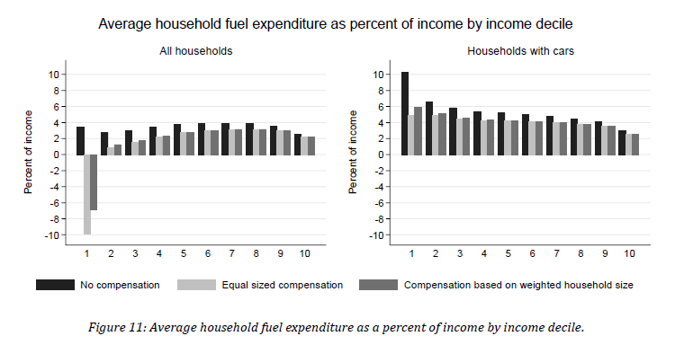 When looking at all households, fuel expenditure as a share of income is relatively small, approximately below 4 percent, and is the highest for households in the 6th-8th income deciles. However, when we only look at car-owning households, fuel expenditure as a share of income is considerably higher for low-income households – fuel expenses are over 10 percent for the lowest income decile and below 3 percent for the highest income decile.