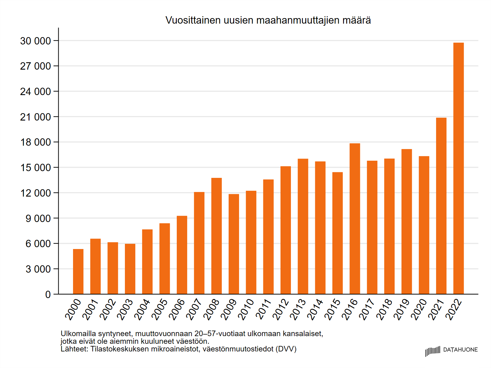 Maahanmuuttajien määrä on tehtyjen rajausten takia luonnollisesti pienempi kuin Tilastokeskuksen raportoimat kokonaismaahanmuuttoa koskevat luvut, mutta kehitys on samanlainen. Kokonaismaahanmuutto Suomeen oli poikkeuksellisen runsasta vuonna 2022, ja jo vuonna 2021 maahanmuutto oli ollut suurempaa kuin aiemmin 2000-luvulla5. Vuoden 2023 ensimmäiset kuukaudet näyttävät trendin jatkuvan6, etenkin mikäli tilapäistä suojelua hakeneet ukrainalaiset jäävät maahan ja hakevat kotikuntaa.