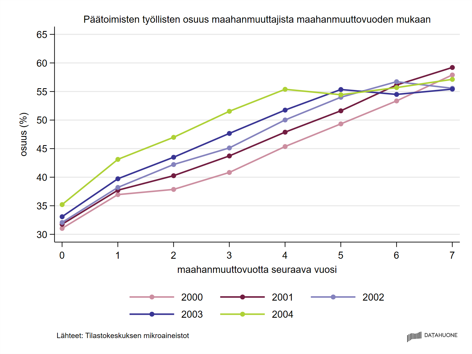 Kuviosta 3 nähdään, että 2000-luvun ensimmäisinä vuosina tulleista maahanmuuttajista noin 30–35 % oli tulovuotensa lopussa päätoimisia työllisiä. Kaikilla kohorteilla päätoiminen työllisyys kasvoi selvästi maassaoloajan mukaan ja oli seitsemäntenä vuonna maahantulon jälkeen noin 55–60 %.