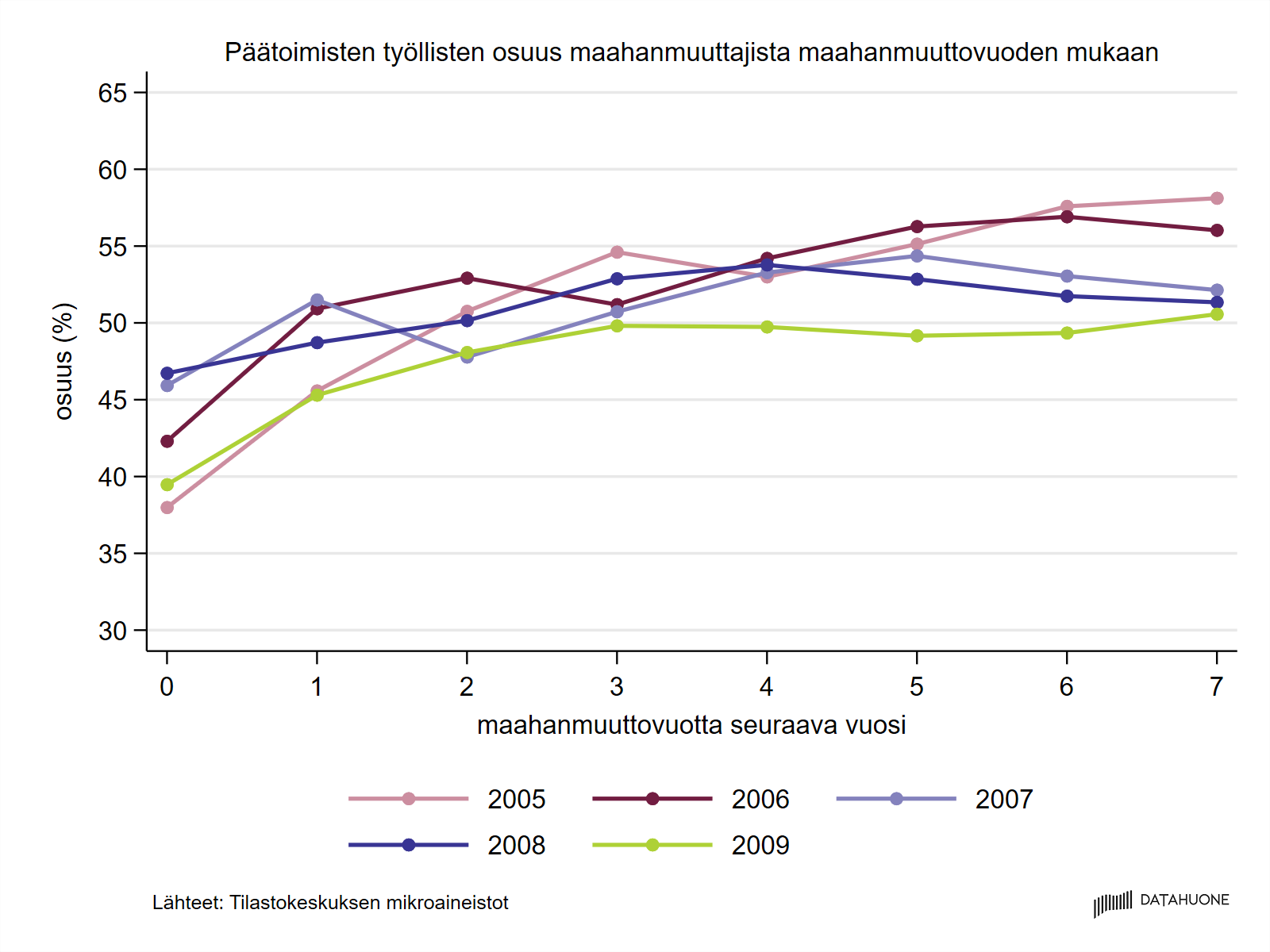 Kuvion 4 perusteella vuosina 2005–2009 muuttaneilla kohorteilla päätoimisen työllisyyden lähtötaso oli pääosin edellisiä kohortteja korkeampi, mutta päätoiminen työllisyys kehittyi sittemmin paljon heikommin; seitsemäntenä vuonna maahanmuuton jälkeen päätoiminen työllisyys oli 50–55 %, vaikka parilla kohortilla jo lähtötaso oli yli 45 %.