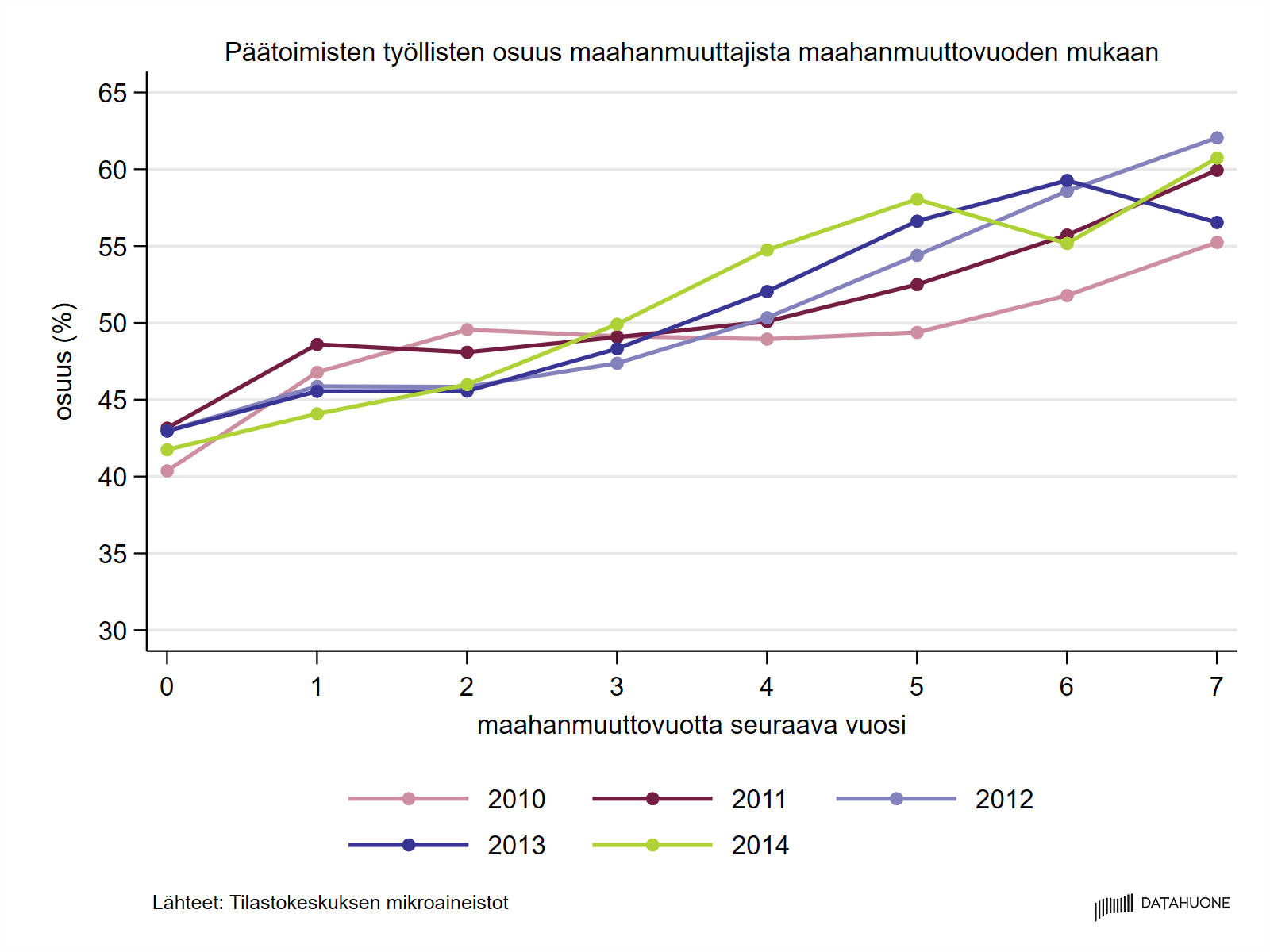 Kuviosta 5 nähdään, että vuosina 2010–2014 maahan muuttaneiden päätoimisen työllisyyden lähtötaso oli 40–45 %, ja se kehittyi suotuisasti maahantulon jälkeen päätyen noin 55–60 %:n tasolle seitsemäntenä vuonna maahantulon jälkeen. Päätoiminen työllisyys kehittyi näillä maahanmuuttajakohorteilla finanssikriisin aikaan tulleita paremmin mutta ei yhtä ripeästi kuin 2000-luvun alussa tulleilla.