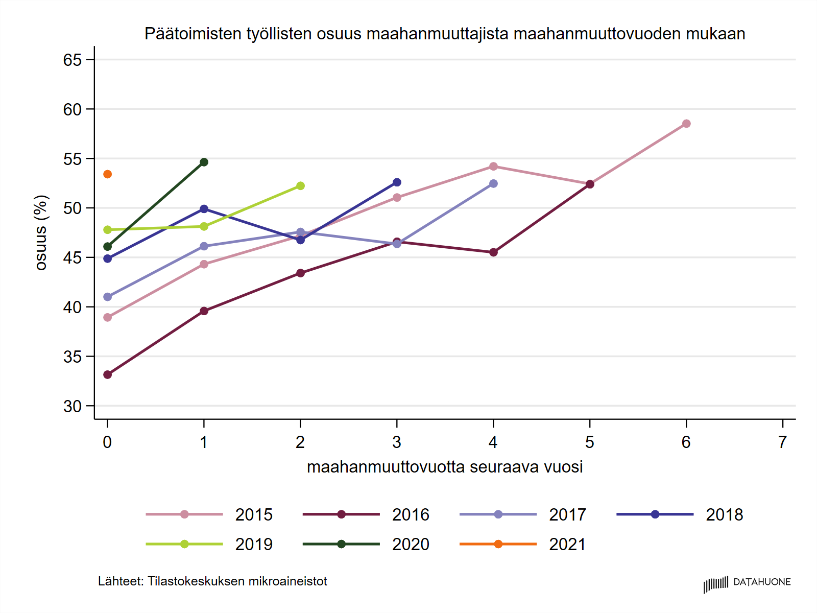 Etenkin koronavuosina 2020 ja 2021 muuttaneiden päätoimisen työllisyys on ollut korkealla tasolla. Vuonna 2020 tulleiden päätoiminen työllisyys oli ensimmäisenä vuonna maahantulon jälkeen lähes 55 % eli tasolla, jonka monet aiemmat maahanmuuttajakohortit saavuttivat vasta useamman vuoden maassaolon jälkeen. Vuonna 2021 tulleiden päätoimisen työllisyyden lähtötaso taas oli poikkeuksellisen korkea, lähes 55 %.