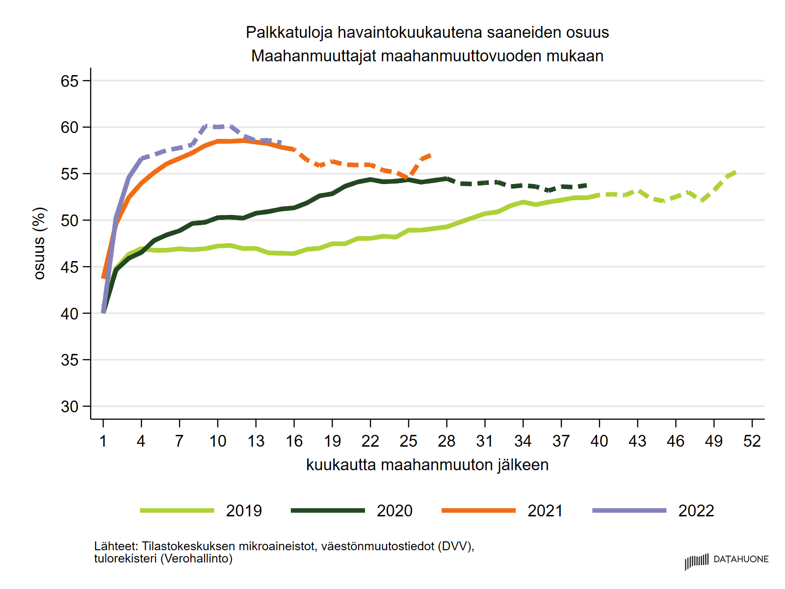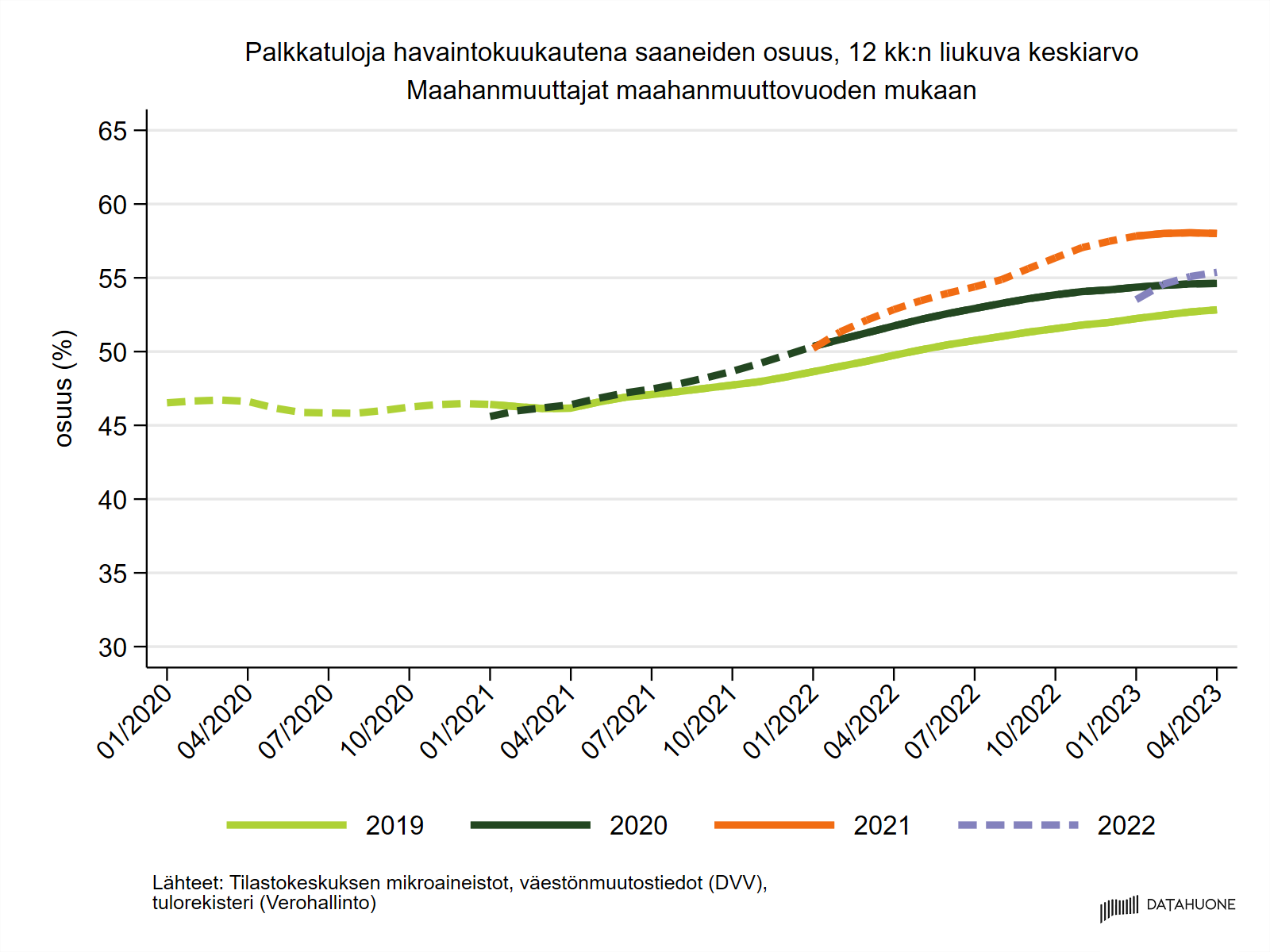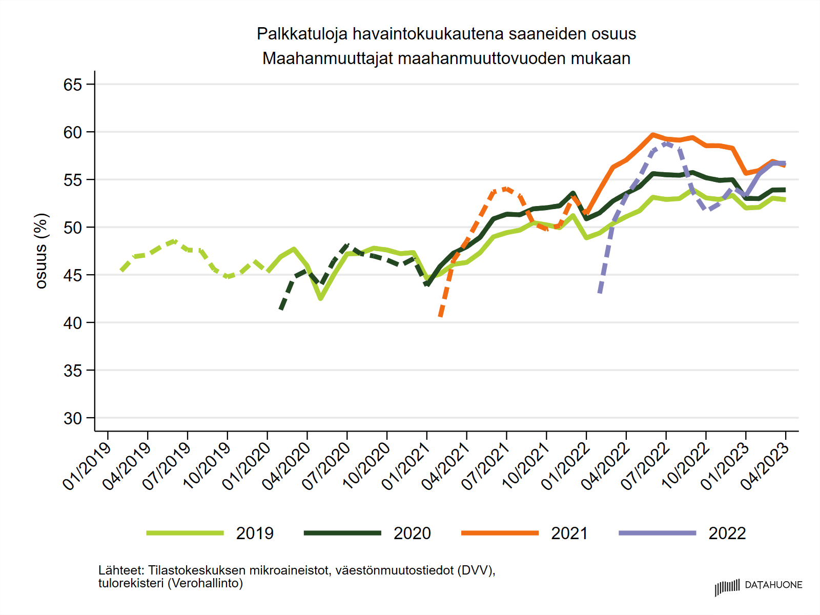 Kuviosta nähdään, että palkkatuloja saavien osuus kasvaa voimakkaasti ensimmäisinä maahantulon jälkeisinä kuukausina, etenkin vuosina 2021–2022 muuttaneilla. Vuosina 2021 ja 2022 muuttaneilla palkkatuloja saavien osuus oli vuoden maassaolon jälkeen selvästi vuosina 2019 ja 2020 muuttaneita korkeampi, joskin vuonna 2022 tulleista vasta tammi–huhtikuussa muuttaneet ovat olleet vähintään vuoden maassa.