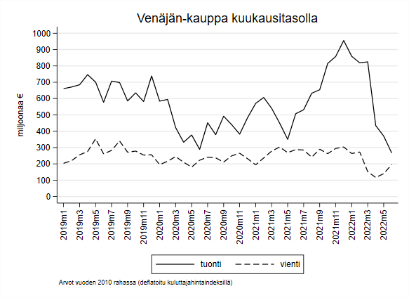 Venäjän hyökkäyksen jälkeen suomalaisten yritysten Venäjän-kauppa on vähentynyt merkittävästi. Kuviossa 1 esitetään Suomen Venäjän-kauppa kuukausitasolla tammikuusta 2019 kesäkuuhun 2022. Vienti Venäjälle romahti maaliskuussa 2022, jolloin se oli enää 55 prosenttia helmikuun euromääräisestä arvosta ja huhtikuussa enää 45 prosenttia. Vienti on kuitenkin huhtikuun pohjalukemien jälkeen jopa hieman kasvanut touko-kesäkuussa 2022.