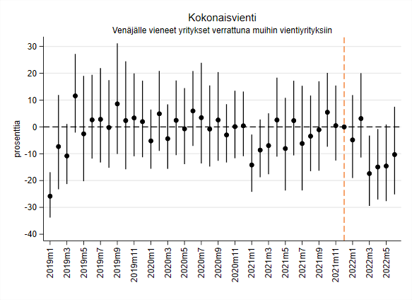 Kuvion 2 tulosten perusteella Venäjälle vieneiden yritysten eli koeryhmän kokonaisvienti (kaikkiin maihin) oli maaliskuusta 2022 alkaen noin 10–20 prosenttia pienempi kuin vertailuryhmällä eli muilla vientiyrityksillä keskimäärin. Tätä ennen selvää eroa ei juurikaan ollut, pois lukien vuoden 2019 ensimmäiset kuukaudet.