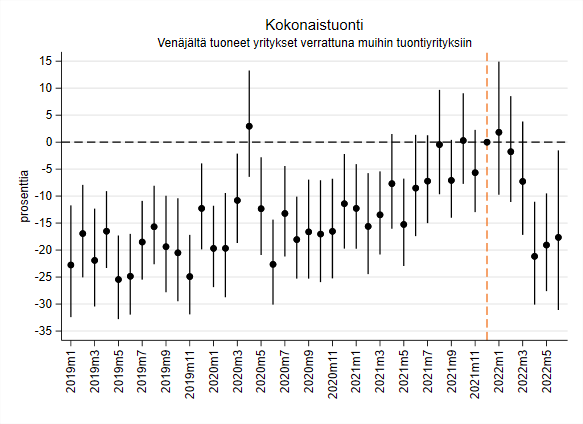 Kuvion 3 perusteella Venäjältä tuoneiden yritysten kokonaistuonti (kaikista maista) alkoi vähentyä maaliskuussa ja oli huhti-kesäkuussa 15–20 prosenttia vertailuryhmää alempi.