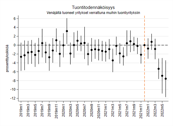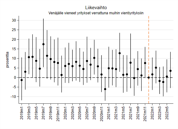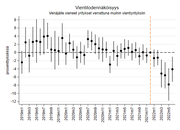 Yritystason regressioanalyysillä tutkittiin, kuinka sota on vaikuttanut yrityksiin, jotka aiemmin harjoittivat Venäjän-vientiä tai tuontia. Vuonna 2019 Venäjälle vieneitä yrityksiä (koeryhmä) verrattiin muihin vuonna 2019 vientiä harjoittaneisiin yrityksiin (vertailuryhmä). Vastaavasti Venäjältä vuonna 2019 tuoneita yrityksiä verrattiin muihin vuonna 2019 tuontia harjoittaneisiin yrityksiin. Vuotta 2019 käytetään yritysryhmien määrittämisessä normaalivuotena, sillä vuonna 2020 kärjistynyt koronapandemia on voinut vaikuttaa ulkomaankauppaan. Selvityksessä verrattiin, miten koe- ja vertailuryhmän liiketoiminnan kehitys kuukausitasolla suhteessa joulukuuhun 2021 eroaa toisistaan. Muita kuukausia verrataan joulukuuhun 2021, koska jo silloin sodan uhka oli suuri Venäjän keskittäessä joukkojaan ja lisätessä poliittisia vaatimuksiaan, millä on voinut olla ennakointivaikutusta yritysten toimintaan.