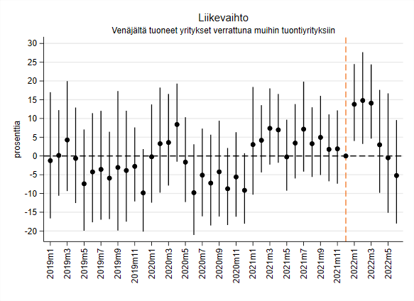 - 2. Koeryhmän eli Venäjän-kauppaa harjoittaneiden tuontiyritysten kohdalla tämä päätelmä voidaan tehdä, vaikka huhti-kesäkuussa niiden liikevaihto näyttää laskeneen verrattuna tammimaaliskuuhun, koska joulukuuhun 2021 verrattuna liikevaihto on kehittynyt samalla tavalla kuin vertailuryhmässä, ja alkuvuoden positiivinen kehitys vaikuttaa poikkeukselta. Lisäksi koeryhmän liikevaihto näyttää noudattavan kausivahtelua siten, että se on alkuvuodesta korkealla suhteessa vertailuryhmään ja laskee huhti-toukokuussa. Ei voida kuitenkaan sulkea pois, että koeryhmän positiivinen alkuvuoden kehitys olisi jatkunut ilman sotaa.