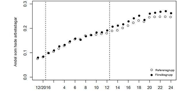 Den aktuella tidsperioden fastställdes i utvärderingsplanen just för att eventuella anpassningsperioder i början och slutet av försöket inte ska påverka utvärderingen. Dessvärre var det omöjligt att förutse att regeringen skulle införa en aktiveringsmodell för arbetslösa 1 januari 2018, alltså mitt under utvärderingsperioden. Av figuren nedan framgår hur sysselsättningsläget i forskningsgrupperna börjar divergera då aktiveringsmodellen införs.